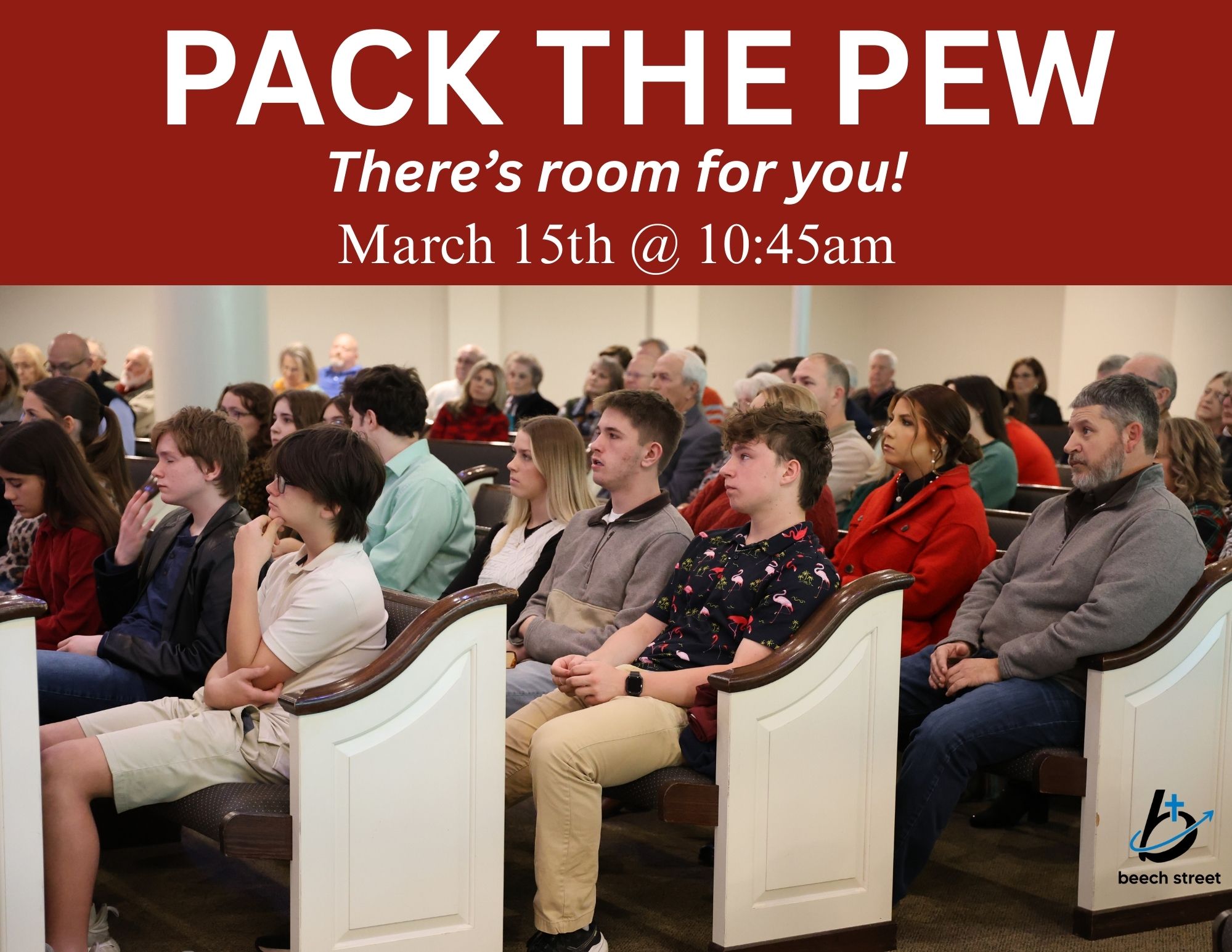Because every seat has a story, we’re setting aside an intentional Sunday to Pack the Pew! While we invite friends all year long, this is a special opportunity on March 15 to bring someone with you to worship – a friend, neighbor, coworker, or family member – and experience what God is doing at Beech Street together.