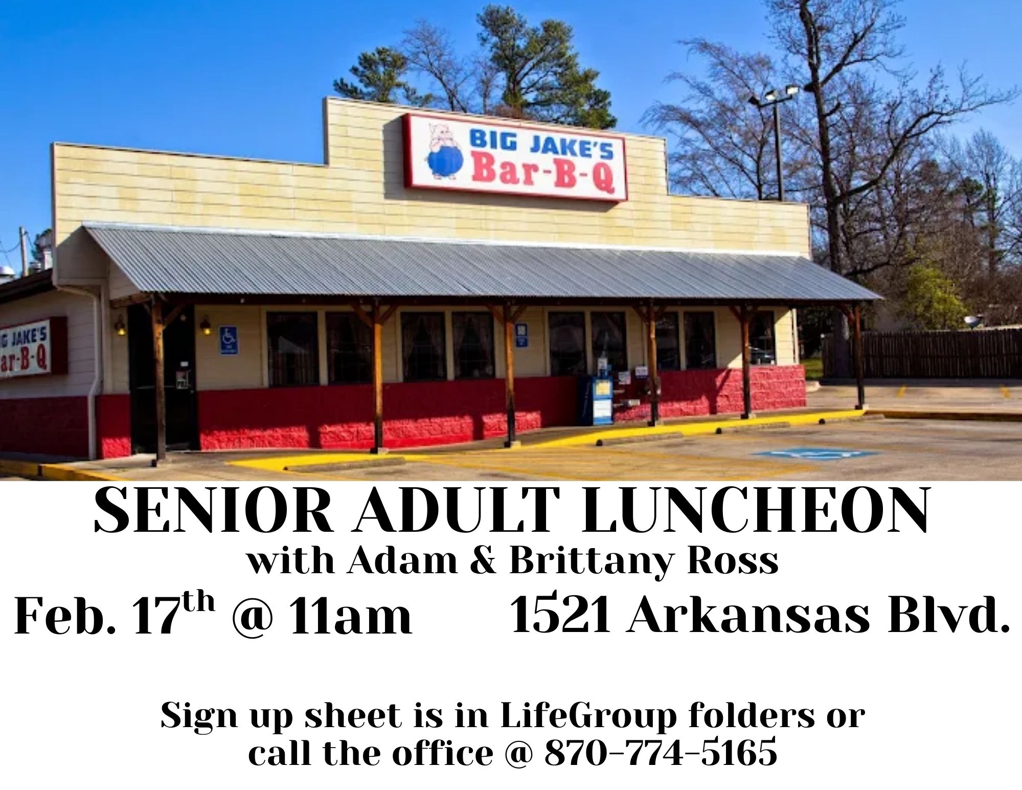 Our senior adults are invited to a special lunch with Pastor Adam and Brittany at Big Jake’s BBQ (1521 Arkansas Blvd). Come enjoy great food, meaningful conversation, and time together as we grow in community and faith. We can’t wait to spend this time with you.