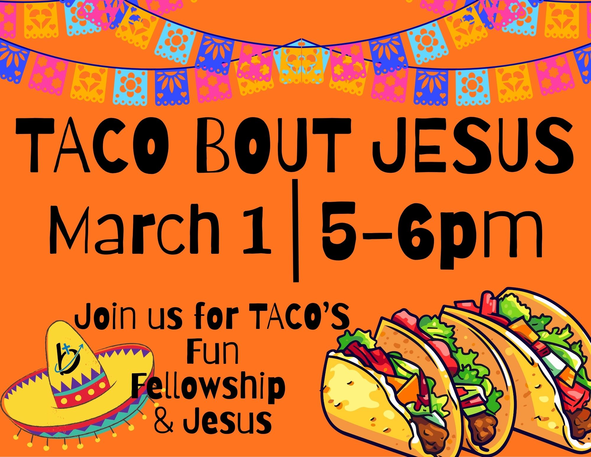 Join us March 1 at 5:00pm in the FAC for Taco ‘Bout Jesus – a fun evening filled with tacos, fellowship, and real conversations about sharing our faith. This will be an encouraging and relaxed time to grow in confidence as we talk about talking about Jesus in everyday life.