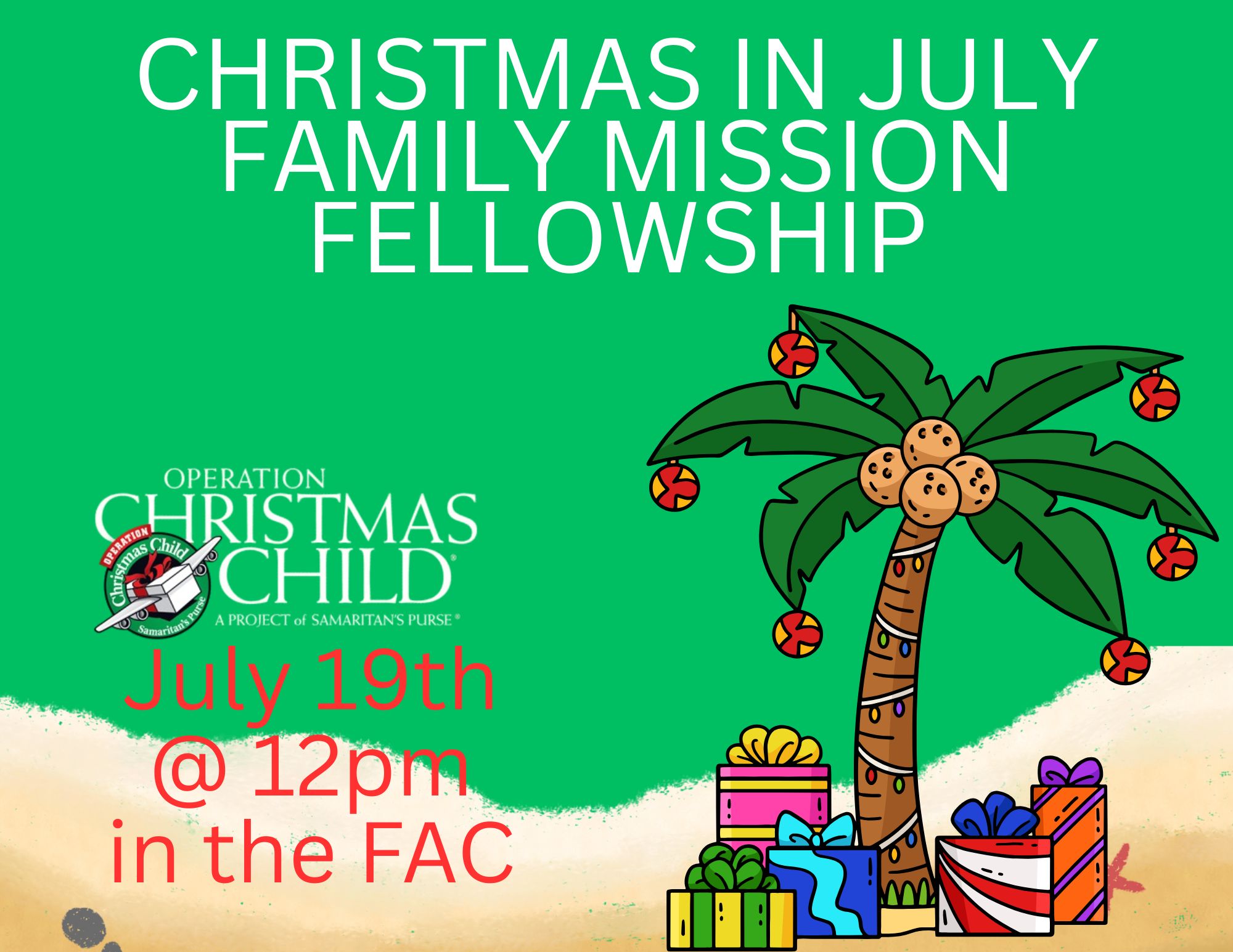 Help us make a child’s Christmas special. We will be gathering items to fill Operation Christmas Child boxes this year. Watch for the Christmas tree, then pick an item or items to purchase and bring to church on July 19th and place under the tree during our lunch fellowship.