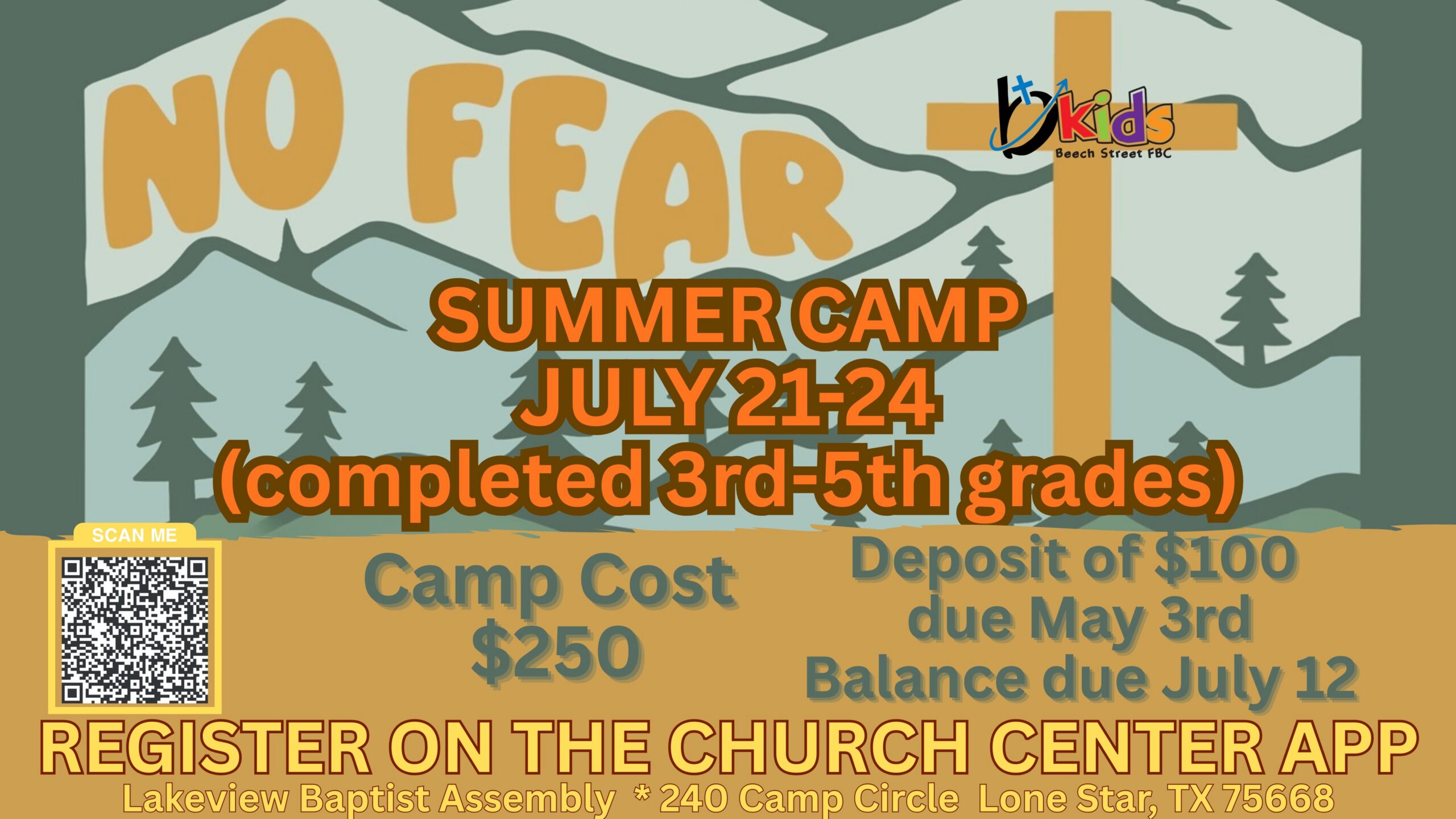 Students must have COMPLETED the 3rd grade to be eligible to attend. Deposit of $100 is due by May 3rd, with the remaining balance due on July 12th. Camp is a time of making new friends and growing in Jesus. If you have any question’s please contact the church office. 870-774-5165